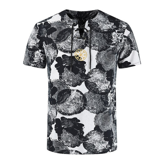 Men's Cotton Linen V-neck T-shirt with Bandage Summer Vintage Printed