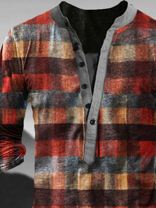 Men's Plaid Half Cardigan Long Sleeve T-Shirt
