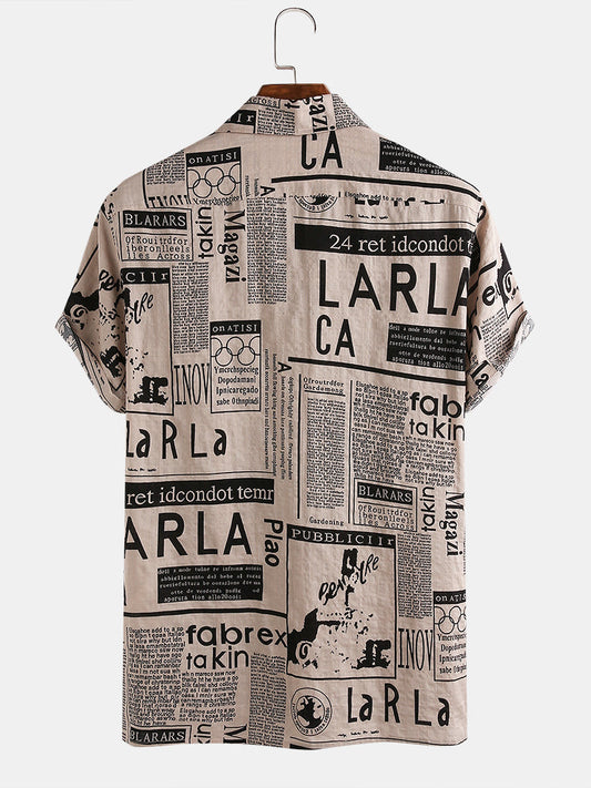 Mens 65% Cotton Fun Newspaper Print Casual Holiday Short Sleeve Shirt