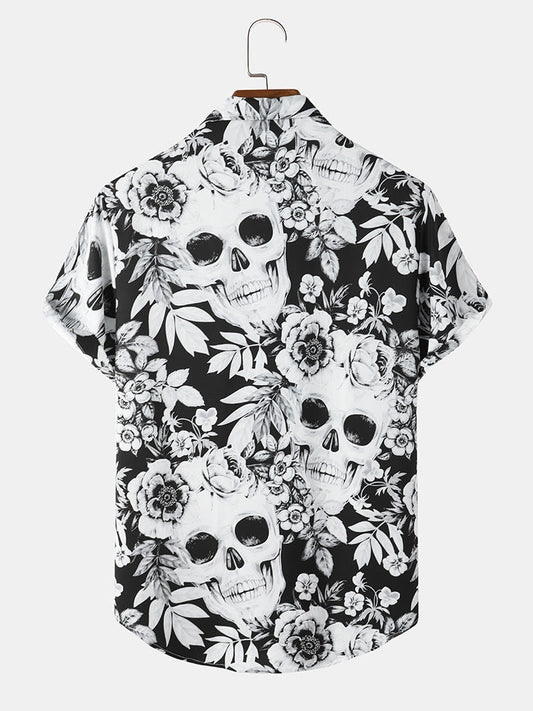 Mens All Over Skull Floral Print Lapel Short Sleeve Halloween Shirts