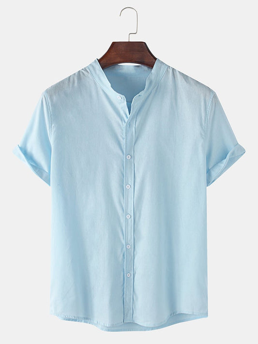 Mens Breathable Flax Stand Collar Solid Color Short Sleeve Shirt SKUF04403