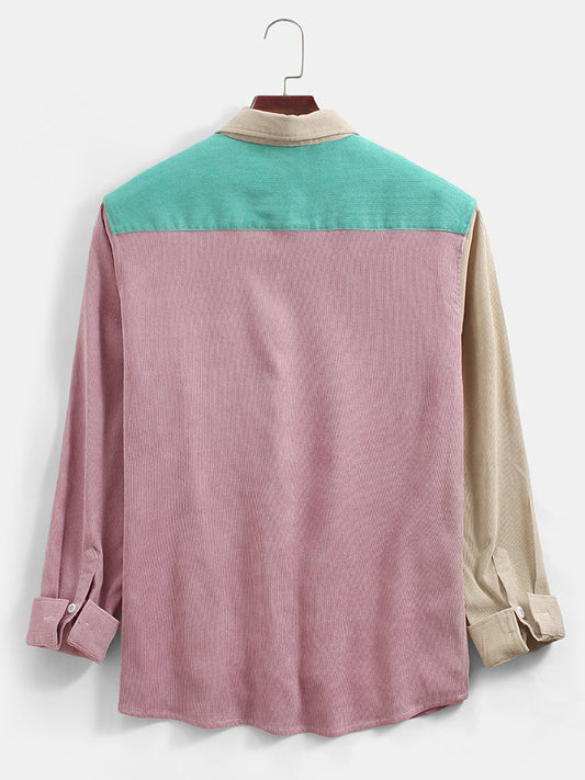 Mens Corduroy Colorblock Patchwork Casual Chest Pocket Long Sleeve Shirts SKUG01153