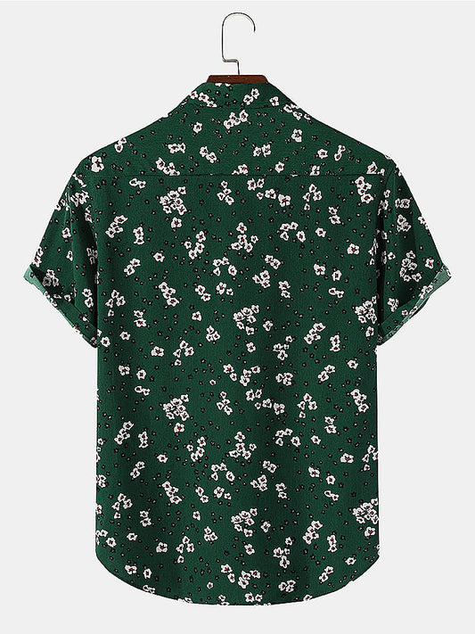 Mens All Over Floral Print Green Short Sleeve Lapel Holiday Shirt