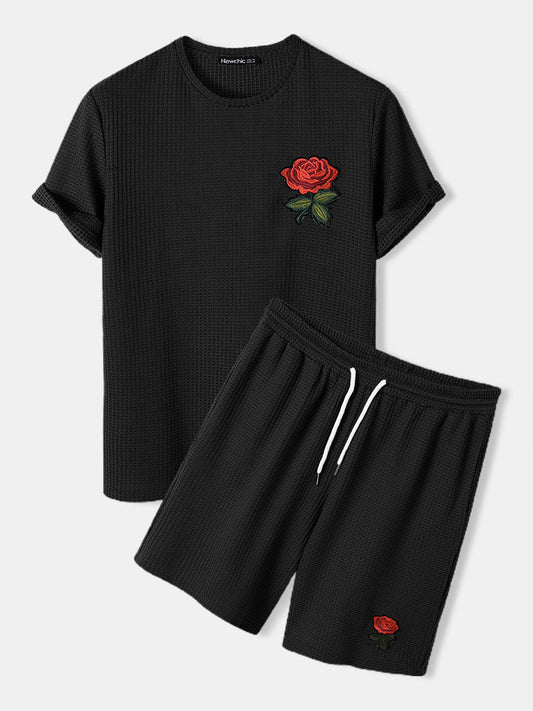 Mens Basic Knitted Rose Embroidery Patch Short Sleeve Casual Two Piece Outfits Cozy Loungewear