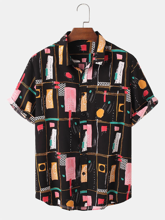 Mens Baroque Color Block Printed Revere Collar Vintage Short Sleeve Shirts