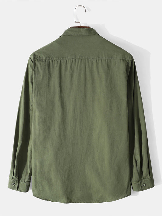 Mens 100% Cotton Double Flap Pocket Solid Casual Long Sleeve Shirts