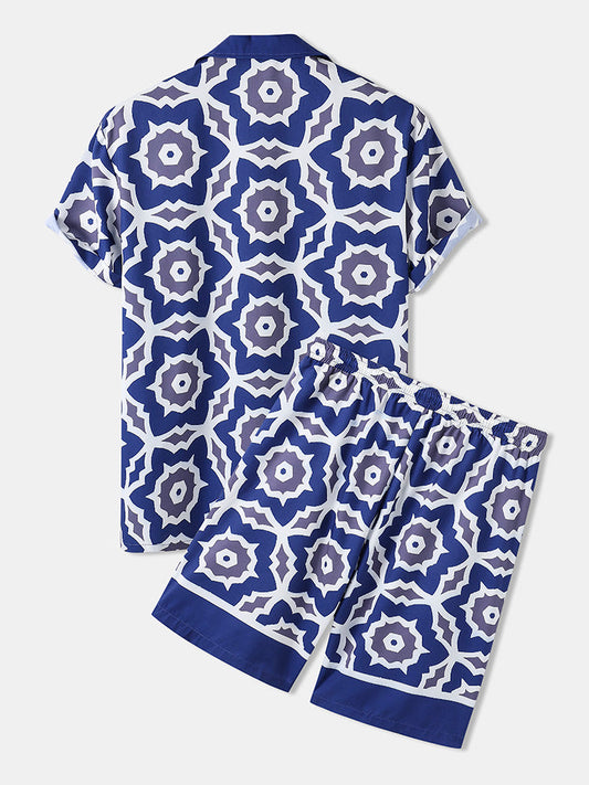 Mens Blue Baroque Print Revere Collar Short Sleeve Shirt & Shorts Co-ords