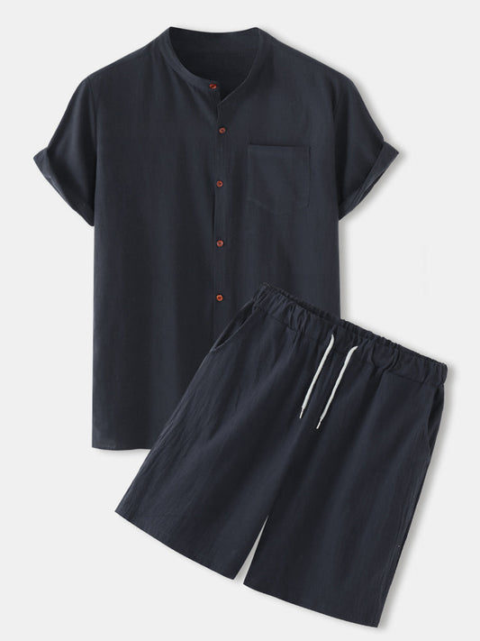 Mens Basic Cotton Linen Grandad Collar Solid Color Loungewear Set