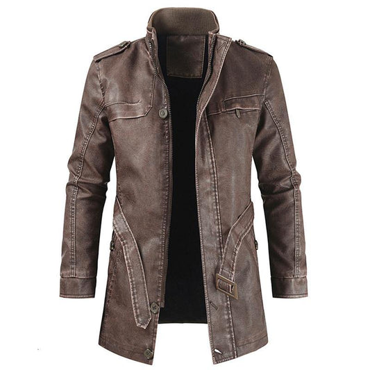 Men Long Thick Fleece Leather Jacket Parkas Men Outfit Warm Pockets Faux Leather Jacket