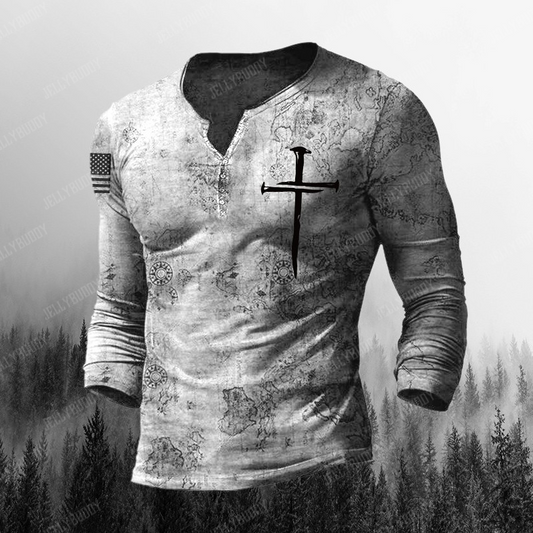 Men's Vintage Old World Map Cross Print Henry Long Sleeve