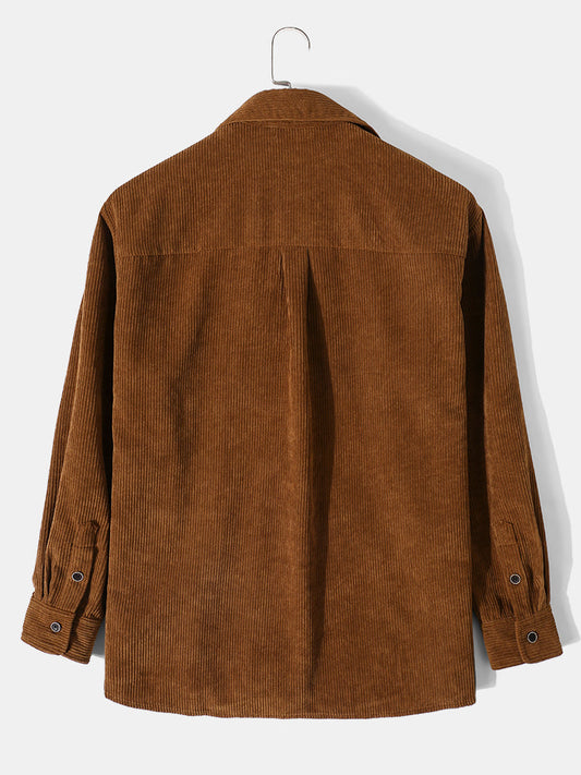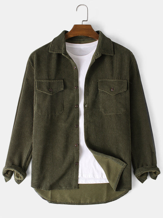Mens Solid Lapel Corduroy Basics Long Sleeve Shirts With Pocket