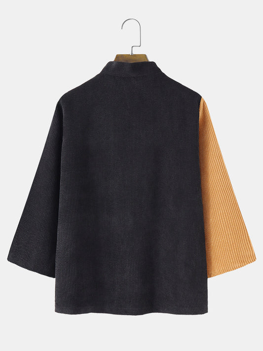 Mens Two Tone Stitching Open Front Corduroy Casual Loose Kimono