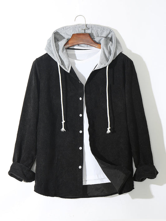 Mens Solid Corduroy Hooded Shirt Casual Two Pieces Outfits With Drawstring Shorts