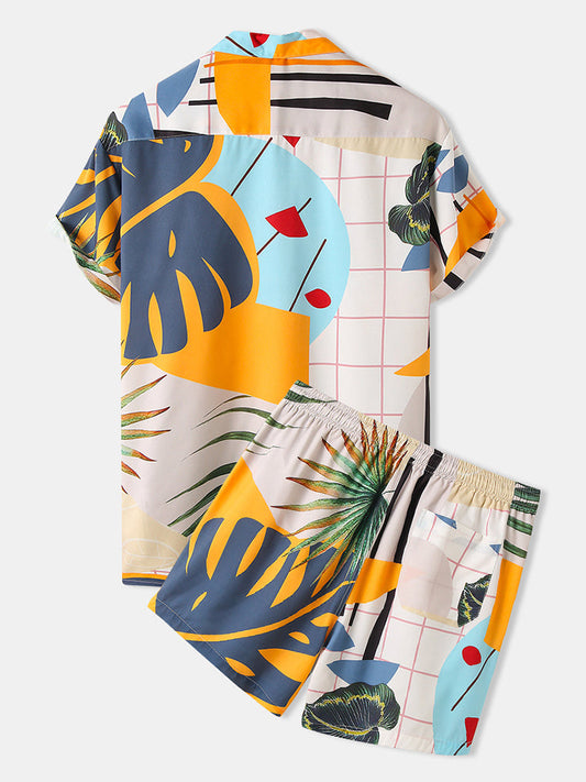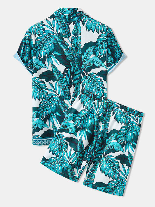 Mens Summer Holiday Revere Collar Tropical Leaf Pattern Baroque Two Piece Outfits