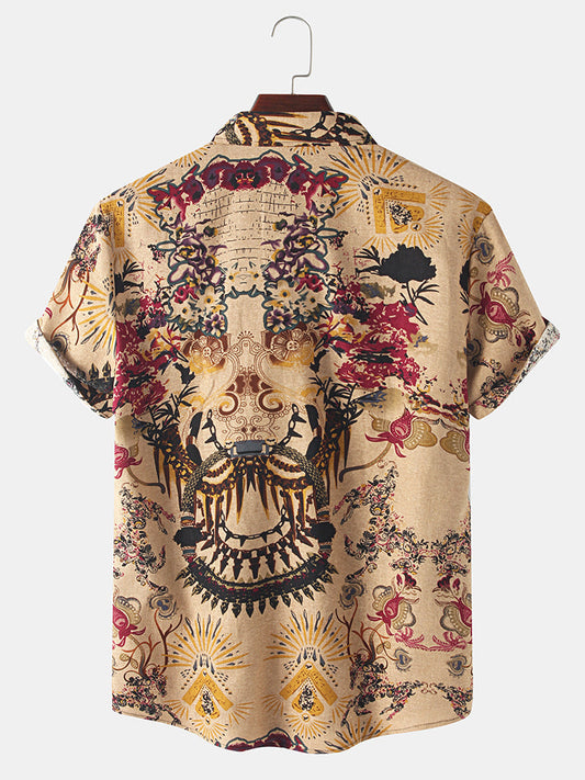 Mens Thin & Breathable Cotton Tribal Pattern Vintage Lapel Holiday Casual Shirt