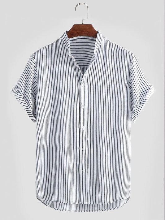 Mens Striped Breathable Stand Collar Short Sleeve Casual Loose Shirts