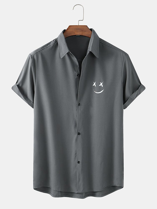 Mens Solid Color Smile Face Print Loose Light Short Sleeve Shirts