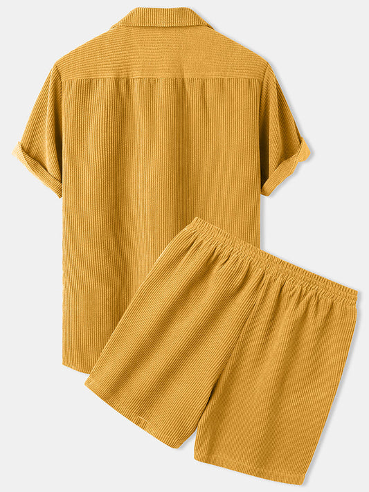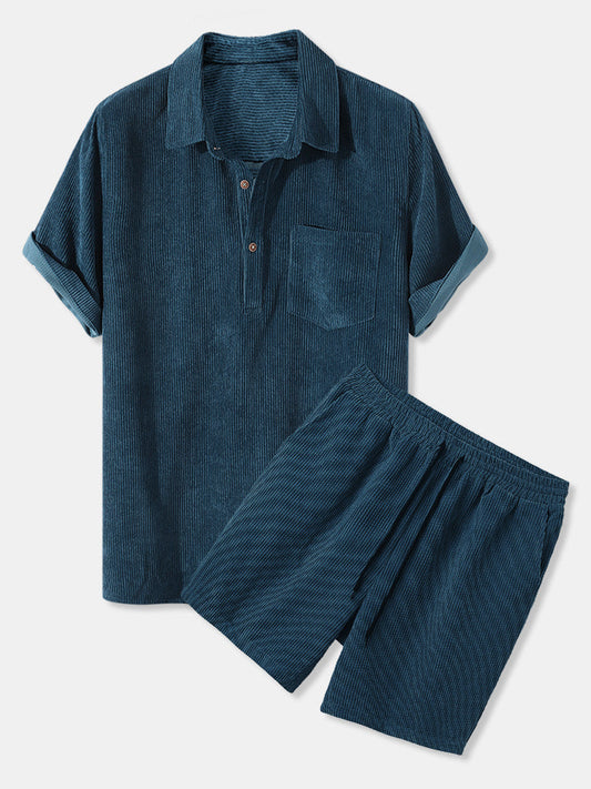 Mens Thin Corduroy Solid Breathable Short Sleeve Shirt & Shorts Set With Pocket SKUH44628