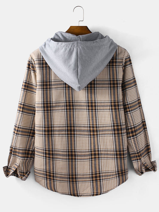 Mens Tartan Plaid Button Up Casual Long Sleeve Drawstring Hooded Shirts