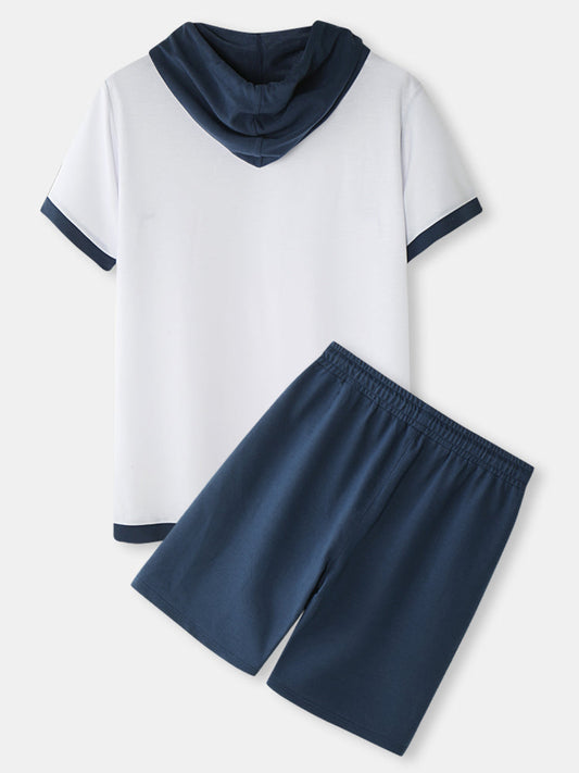 Preppy Style Two Tone Hooded Short Sleeve Drawstring Two Piece Outfits